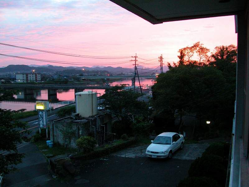 | 宿から見た夕焼け、川面にあり綺麗なところです。