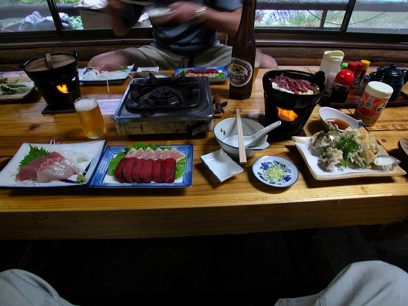 | ところが出てきた料理はすごかった。左側は海の幸、でっかいイセエビ、尾鷲港で陸揚げされた新鮮なかつお、右側の肉はイノシシ、鹿、地鶏、イノシシ、鹿、地鶏もここで飼育されたものときいた。
