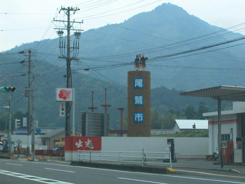 | 尾鷲の町の入口にあるタワー。漁師の服を着たお姉さんが檜の丸太の上で踊っています。