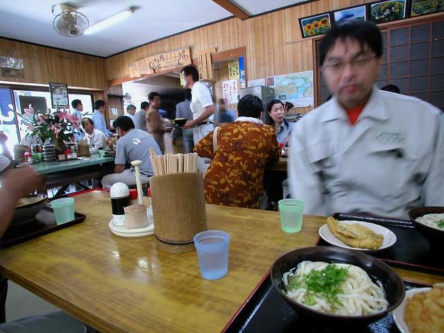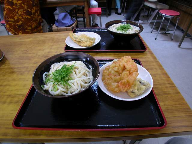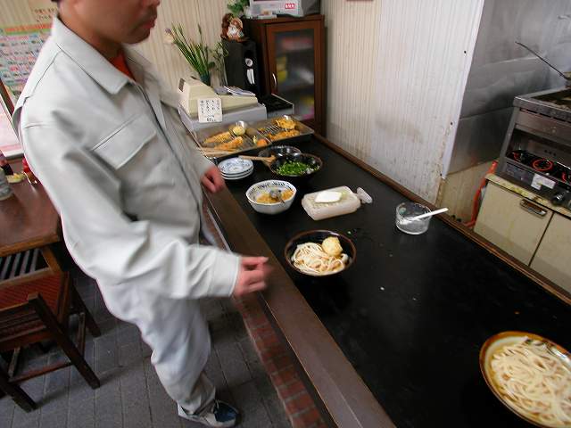 | 大して看板もないのに、昼時になると多くの人が集まってくる。うどんを注文し、てんぷらはトレーから取って最後に料金を払う