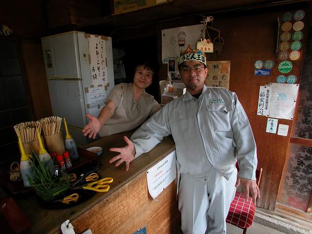 | ここのおばあちゃんはうどんを食べに着た人と記念写真をするのが楽しみながら行っている。私たちも記念写真を撮らせていただきました。左は畑から取ってきたネギを刻むハサミ