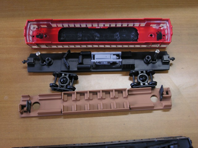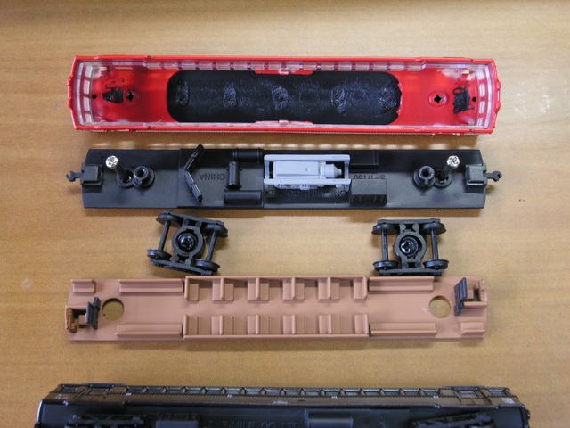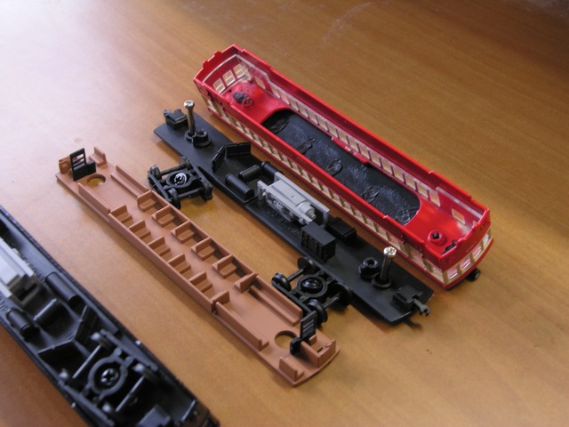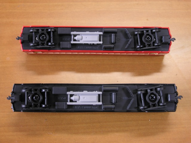 | 床下です。下がキハ41000、上がキハ048になります。キハ048はラジエターにの位置が異なりますが、さすがに改造し尽くされた姿を再現するのは困難なのではと思いました。