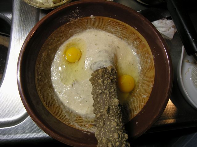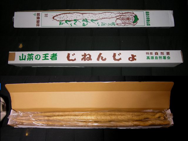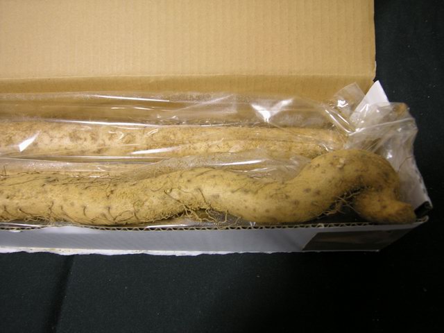 畑でとれたじねんじょです。お土産品としてはんばいされます。すりおろすと、とても粘りがあっておいしいとろろができました。 |