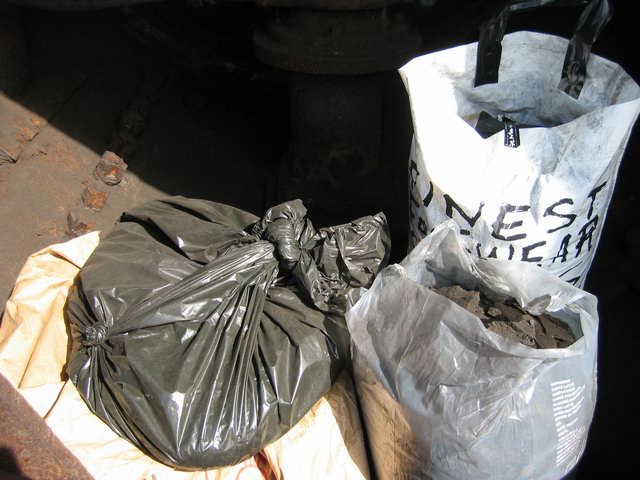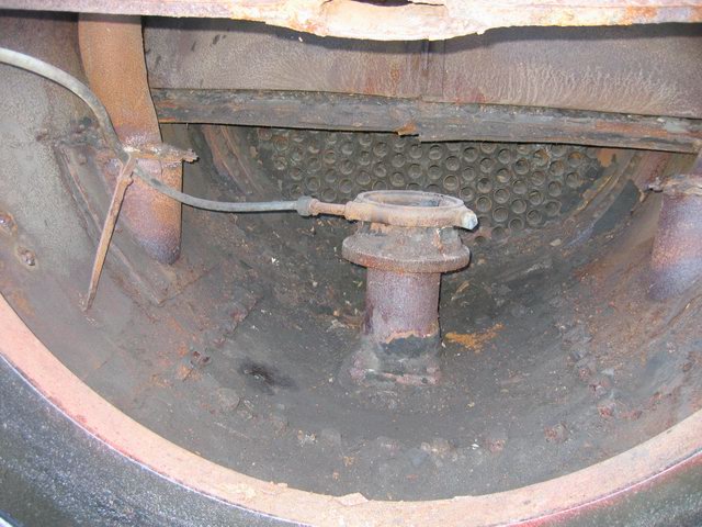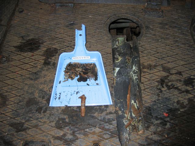| 初めて見た煙室内、石炭カスがたくさん溜まっておりました。ヘラと箒、塵取り(スコップでは追いつかず)にて扉手前の溜まっているカスを集め、足元を綺麗にして煙室内の中へ入りました。