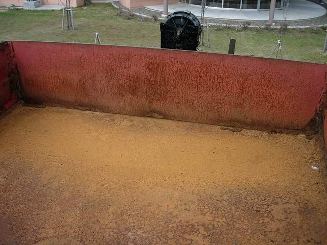 | 炭水車の上面は、錆だらけでひどい状態になっています。ワイヤーブラシなどでは歯が立たないのでグラインダーを使って錆落しをしますが、ものすごいホコリが出るとともに、あっという間にグラインダーのカップワイヤーがだめになってしまいます。