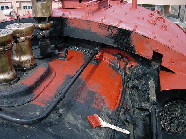 現車は昨年秋以来ですが、冬季のシート掛けで良好な状態に保たれています。早速作業を開始します。運転室屋根からケレン作業を始め、スクレッパーとワイヤーブラシを使って古い塗膜を削っていきます。次いでボイラ上部から砂箱へと進みます。砂箱は古い塗膜が剥がれて凸凹になっているので、丹念に剥がしていきます。また、しっかり喰いついている塗膜もできるだけ表面を荒らして、塗装ののりを良くしていきます。
