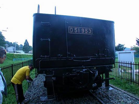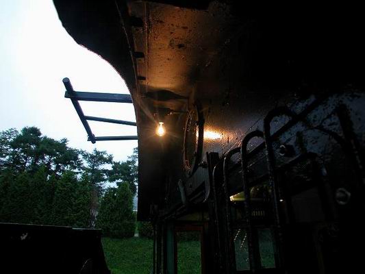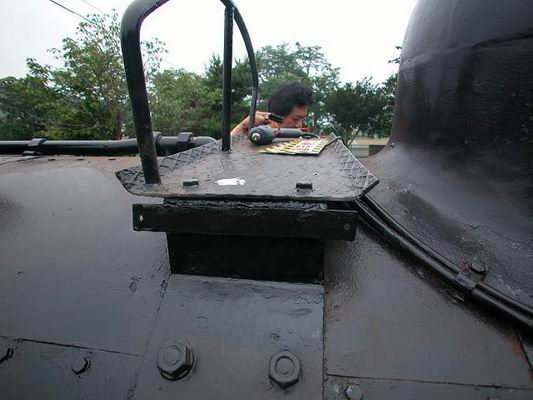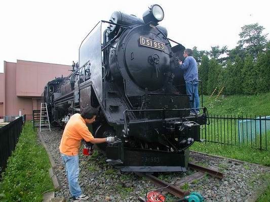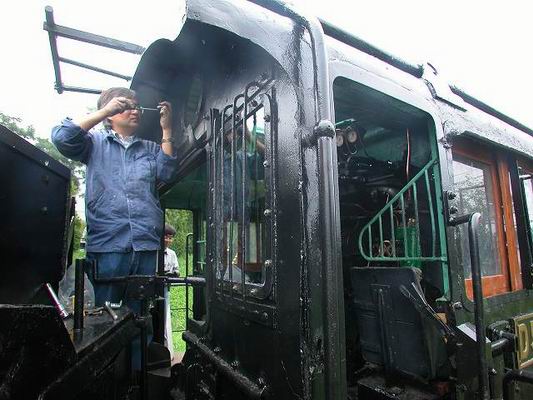 | 寅さんによる塗料のタッチアップ状況です。5月の修理時の塗り残し個所を仕上げていきます。あまりにも多く、今回完全に仕上げられませんでした。その傍らで工場長が電気配線作業を行っています。
