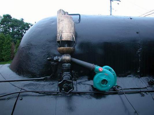 | 送風機を用いて汽笛を鳴らしました。こんな簡単な方法でも汽笛は鳴ります。小さいですが