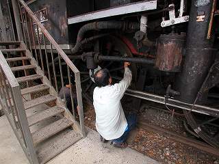| 松嶋キハ048会会長は動輪の剥離した塗装の除去を行なってくれました。