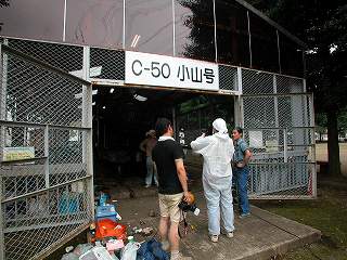 | 16:30 電動塗装機による作業を終了した状況です。電動塗装機は非常にスピーディーに作業が行えますが、塗料の粘度を整えるのが難しく、噴霧力が乏しいので、風が吹くとあちこちに飛び散ってしまいます。豊浦・紋別での塗装作業では体中真っ黒になってしまいました。今回は塗料の調整はT.K生さんが行って頂き、紋別での苦労を共にしたためか、息もばっちりで、屋根の中のため風も無く、実に快適に作業ができました。