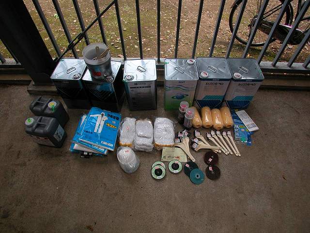 | 左上からウレタンクリアースプレー、ローラー替、ビニール手袋(剥離剤用)、中段左から軍手、刷毛(大、中、小)、下段はディスクグラインダー用
