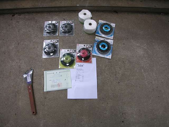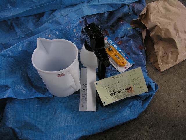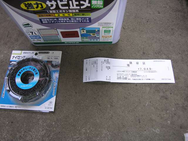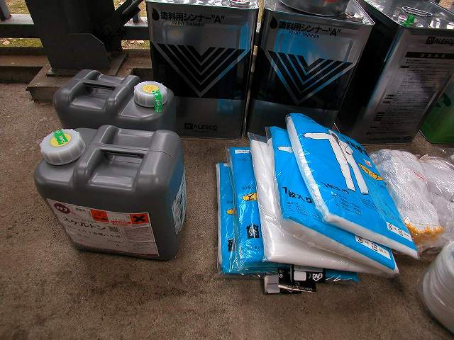 | 1回目に購入した資材すべてです。塗料、刷毛、軍手、ディスクグラインダー用パット、剥離剤、紙製つなぎなどをつくば市にあるジョイフル本田にて購入しました。