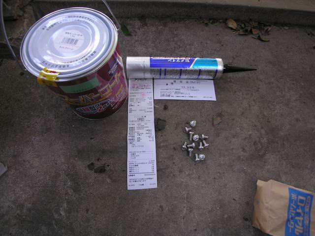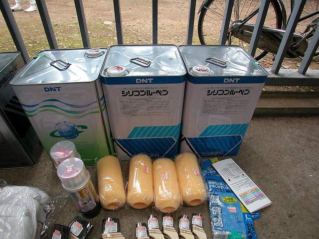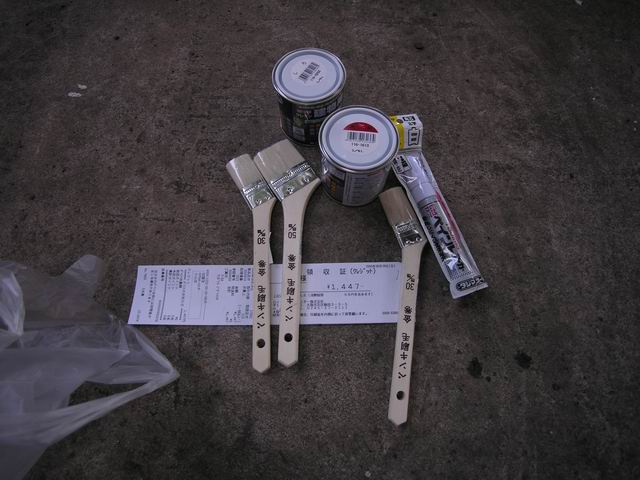 | 塗料です。左からエポキシ系下地塗料、右側の2缶は上塗用のシリコン変性アルキド塗料です。今後、長期にわたり塗装されないことが考えられるので、なるべく退光性が良く、しかも退行した際も少しでも輝きを保つように艶ありの塗料を購入しました。