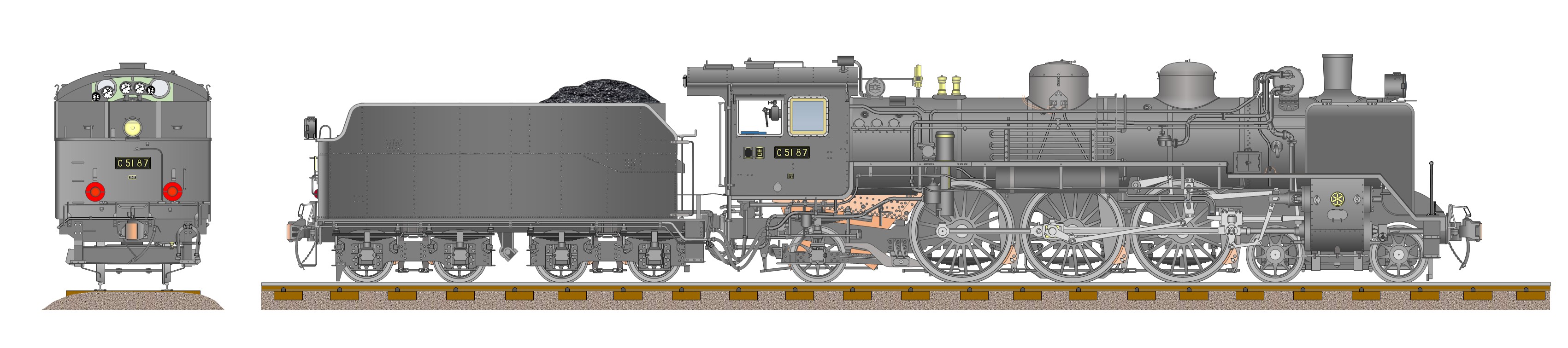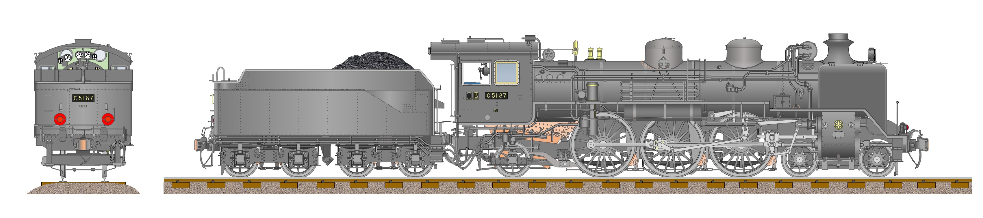 廃車が早く現役時代の写真が見つかりませんが、残存状況より現役時代の姿を想像しております。キャブは全溶接構造でほかのC51 にみられない姿です。煙突も9600用のものに取り換えられています。C51標準の本省設計型デフ、8-17テンダーを有し、保存されている中では最も標準形に近い形状をしています。