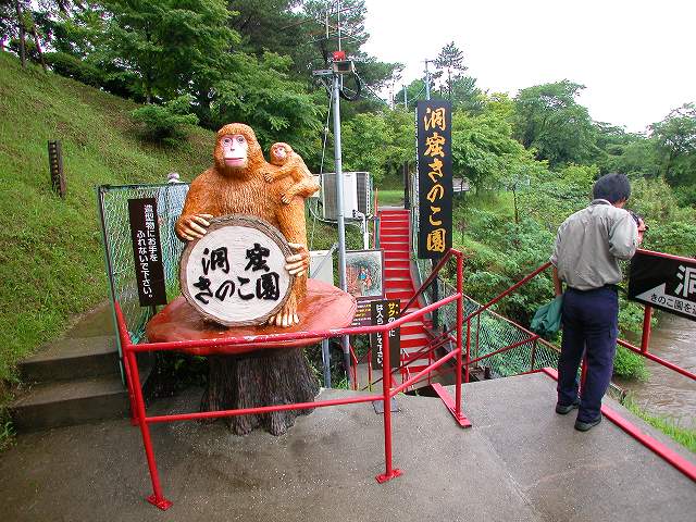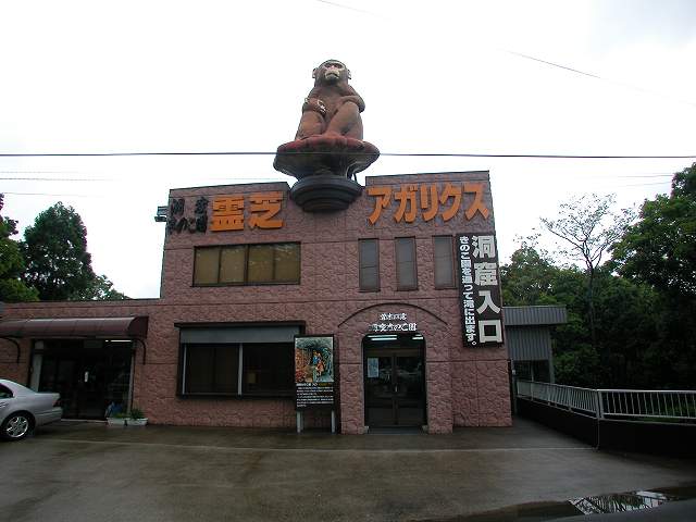 | 洞窟キノコ園入り口の建物。サルが猿の腰掛にのる姿がこっけい