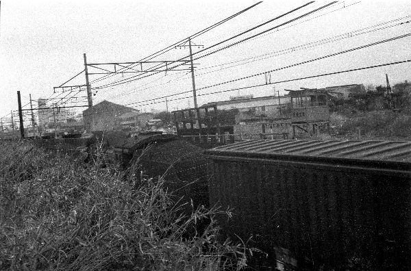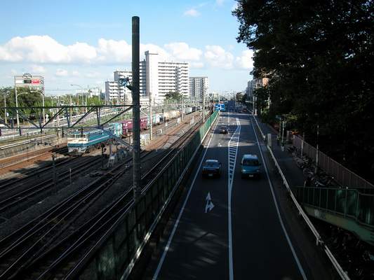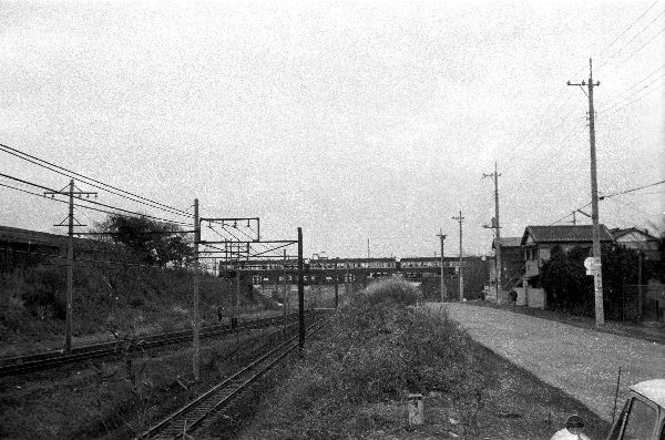 | 遠くの鉄道橋上を新京成の電車が通過しています。総武線は手前 側の上り線と向かい側の下り線とでは段差があります。これは上 り線が勾配緩和のため掘割りを長くとってあるのに対し、下り線は ギリギリまで地表を走った後新京成のアンダークロスする直前に 23パーミルで一気に下るためだそうです。